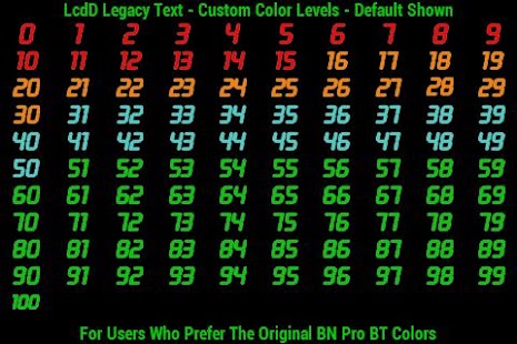 For users who prefer the original green color and LcdD transparent font that was included in early versions of Battery Notifier Pro BT. This font may still be used along with the custom blue, orange and red text color level options in Battery Notifier Pro BT.