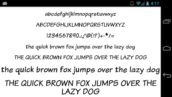 Please enjoy this pack of Fonts for Android flip fonts to provide you with the ability to change your device’s typeface for free. Using the FlipFont font changer program installed on your Samsung Galaxy or HTC Sense 6.0 phone, you can use this application to customize your device to one of the many beautiful fonts for Samsung Galaxy that we have collected. This font pack is a random selection of 50 typefaces that have been optimized for use on Samsung Galaxy and HTC Sense 6.0 Android devices. Please browse through our FlipFont packs to find the perfect font styles that fits your taste.