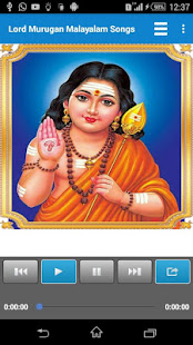 Lord Murugan devotional Malalyalam songs with play, pause, next, previous, select song features.