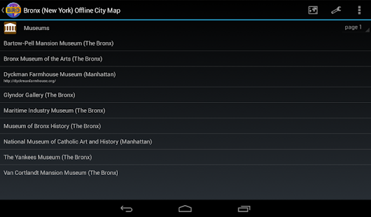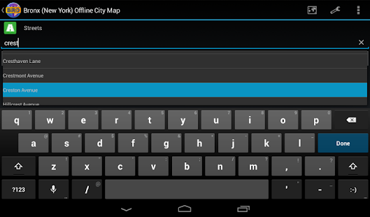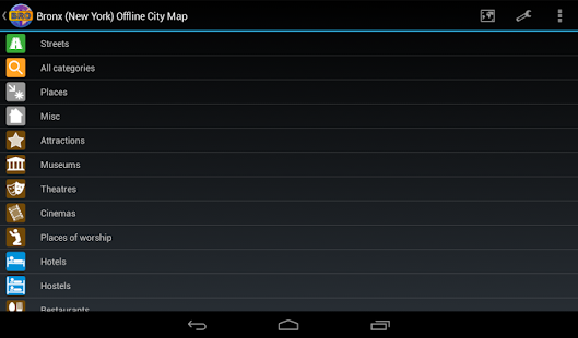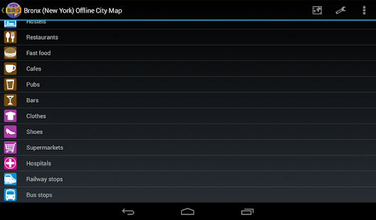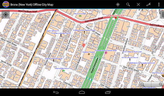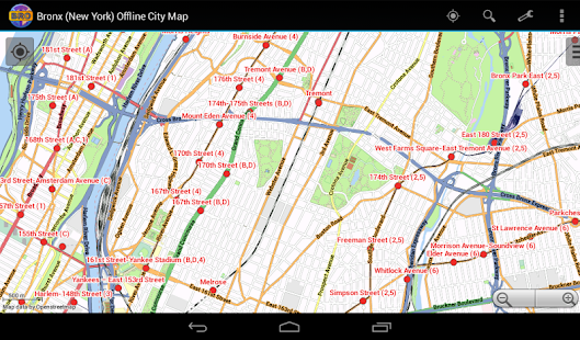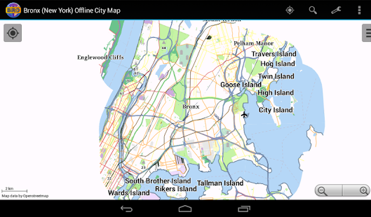 Aplikace poskytuje offline mapu Bronx využívající populárního projektu Openstreetmap. Po instalaci není nutné internetové připojení ani pro procházení mapou ani pro vyhledávání.