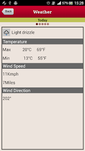 ✔ Weather info like raining status, temperature min, max in degrees and foreign heat and wind speed details.
