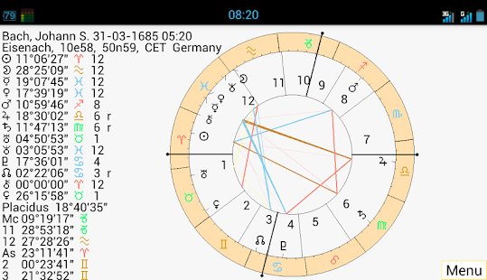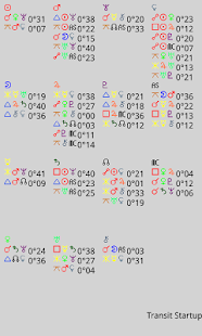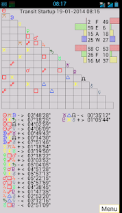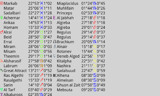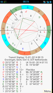 - Several screens with all kinds of data like latitude / speed of planets, true asc / mc and housecups, aspects, midpointtrees, asteroids, uranian bodies, dignities, planetpatterns, planet nodes etc.