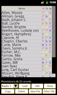 - Database manager for horoscopes, Delete or Edit Horoscope, Create other databases, Copy horoscopes between databases.