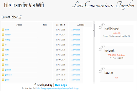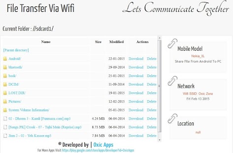 Nyní Sdílení souborů mezi notebookem, Smartphone, android televize, a jiné inteligentní zařízení je nyní více obtížný úkol. Přeneste soubor nebo složku z vašeho telefonu pomocí wifi. Nyní kopírovat nebo smazat soubor bez připojení kabelem USB stačí nainstalovat tuto aplikaci a umožnit wifi a klepněte na tlačítko ON. Zadejte adresu URL poskytované touto aplikací v prohlížeči nebo jiný přístroj má všechna data na vašem zařízení bude tam se podle zařízení, sítě a informace o umístění. Můžete manipulovat, že data. Sdílení dat pomocí File Transfer pomocí WiFi na účinném snadným a jednoduchým způsobem.