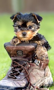 Sladký Yorkshire pes sedí ve velkém boty. V roztomilé tapety psa existují dva zázemím na výběr. V prvním pozadí Yorkshire štěně bliká, přesune svůj nos, voní obrazovka. Na druhé pozadí Yorkshire pes má sluchátka, poslouchá hudbu a kývá hlavou na hudbu.