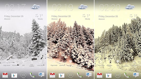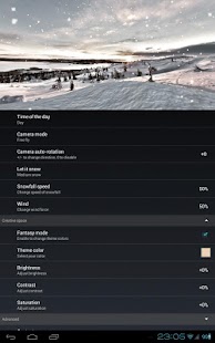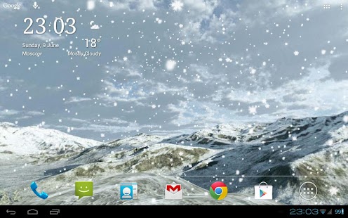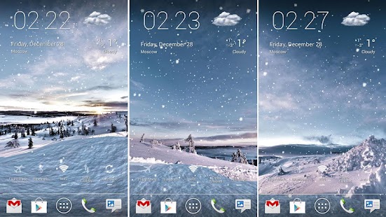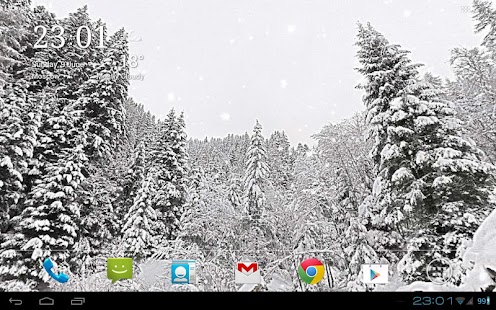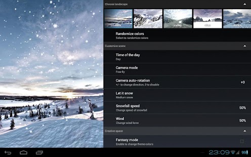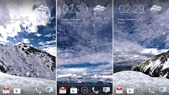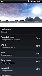 Choose between forest, mountains, hills, rocks, valley or ice alien planet. Relax watching on gently falling snowflakes. Make it light snow or heavy snowfall, daytime or evening (automatic daytime requires Google Location Service to be enabled), windy or calm.