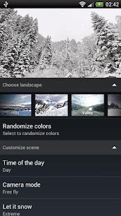 Free version includes 1 winter landscape (forest), automatic time of the day, free-fly camera mode, random color themes, but no customization options.