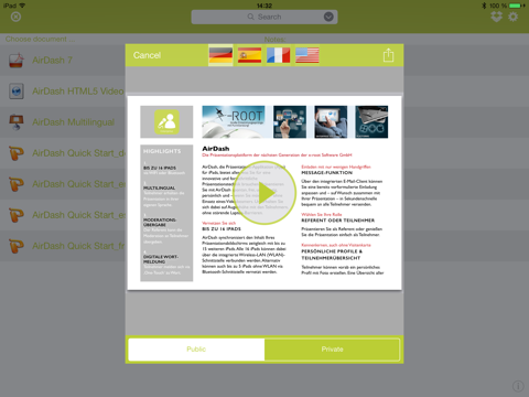 By selecting the ‘public’ or ‘private’ option you determine beforehand whether the participants can keep the document on their iPads after the presentation or whether it will be automatically deleted after the presentation.