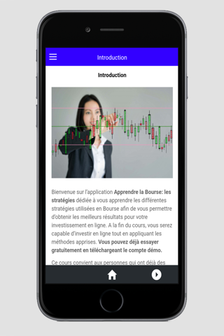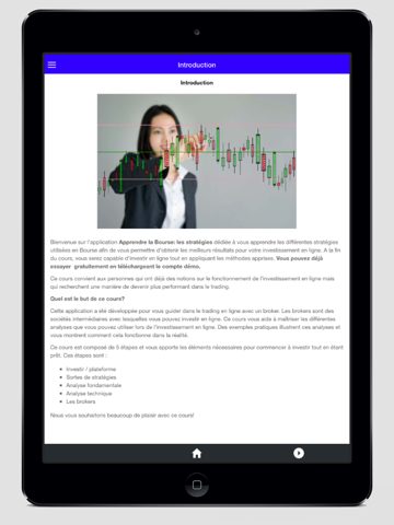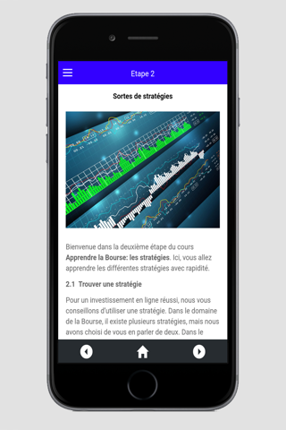 Bienvenue sur l’application Apprendre la Bourse: stratégie. Avec cette application, vous pouvez utiliser votre smartphone ou tablette pour suivre ce cours sur les stratégies de l’investissement en ligne. A la fin de cette formation, vous pouvez commencer à trader!