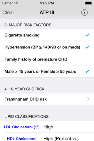 ATP3 Lipids then shows you the lipid classifications and specific therapeutic recommendations of the ATP III based on the lipid panel and risk factors. You can tap a recommendation to view further information.