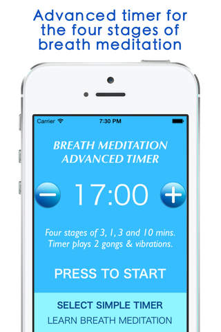 3) The ADVANCED TIMER guides you through the FOUR STAGES of breath meditation. This is an ancient and very powerful method of breath meditation taught in the ancient scriptures. Using the advanced breath meditation timer the four stages can be done more purposefully and with better focus. The advanced timer guides you through the four stages, calming down your breathing while strengthening your awareness.