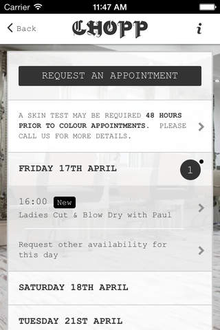 Our free app is the quickest way to check availability and request an appointment. Subscribe to alerts for your favourite stylist's availability, get the latest special offers, find us with our GPS-based maps, and more!