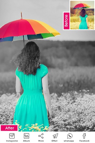 Color Splurge is a photo editor thats Lets you Selective De saturation(Popularly known as selective coloring and recoloring Effect) and Colorize your photos and generate high quality images.No matter how big is the image it lets you generate the High quality output.It is fully integrated to social networks like Facebook.