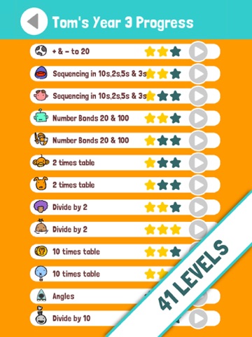 * 41 levels across 5 maps covering addition, subtraction, sequencing, recall multiplication facts of two, three, five and ten and related division facts. Now also includes angles and odds and evens.