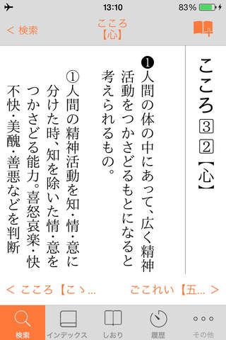 語釈の中で興味のある言葉に指をのせるだけで、思考を止めずに、言葉を次々とたどれます。