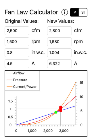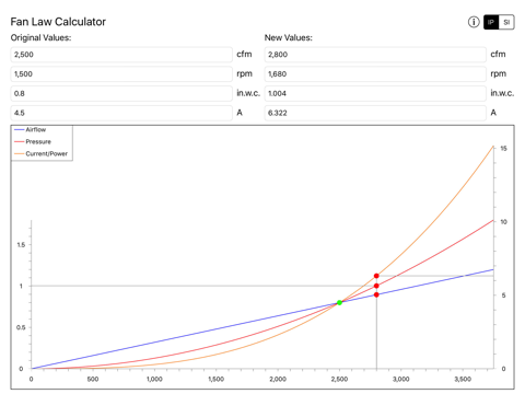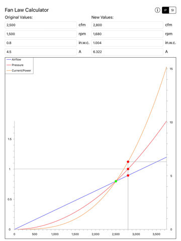 The Fan Law Calculator App has been designed to allow quick estimation of the performance impact of variation in airflow and/or rpm on an existing system. The standard fan law equations are used to estimate the system performance changes.