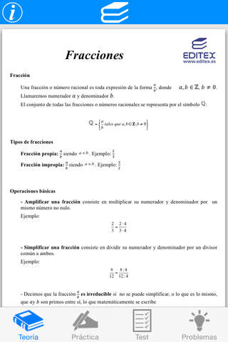 Esta aplicación de Editorial Editex S.A. realiza operaciones básicas con fracciones. Comprende los siguientes apartados:
