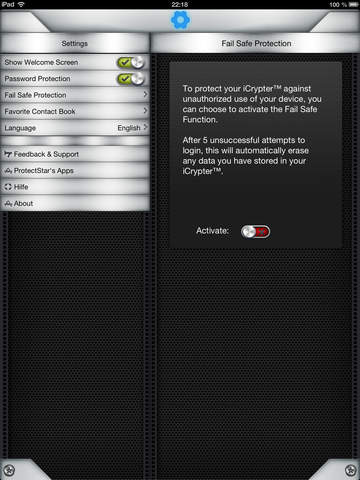 In the event your Apple™ device is lost or stolen, you need not worry about your contacts and secret encryption passwords stored in iCrypter™ falling into unauthorized hands, because with the automatic-delete function activated the app can be configured so that all of your stored settings such as your bookmarks will be deleted automatically after five invalid passwords are entered.