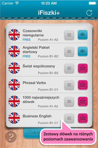 Aplikację iFiszki+ Angielski możesz uzupełniać kolejnymi pakietami słówek od poziomu początkującego do średnio zaawansowanego, np. Angielski 1000 najważniejszych słów dla początkujących, Angielski dla średnio zaawansowanych Życie codzienne, Angielski Słówka i zwroty dla zaawansowanych czy Angielski Business English.