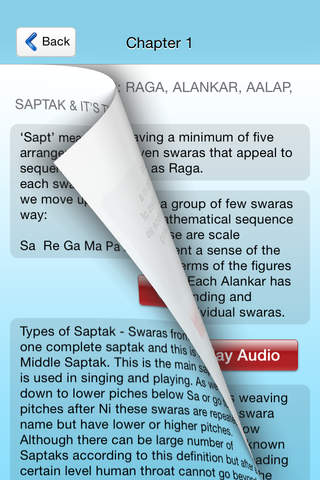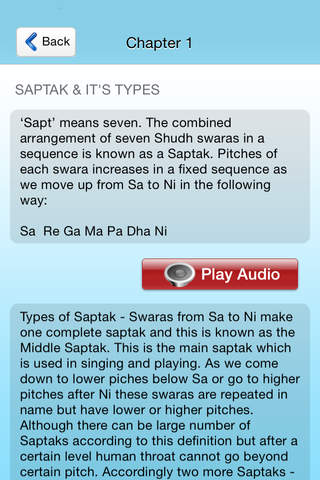 The app is divided into 10 chapters. Each chapter comprises of written content accompanied by musical samples (sung by the developer himself) and sometimes images for illustrations. These chapters are scattered through 3 levels: Beginner, Intermediate and Advanced. Each level ends with an introduction to 5 different Ragas.