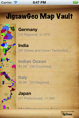 Check all the Options - you can set your default name for the web high scores, choose your difficulty level, enable sounds, enable drag & drop, and set the finger offset (during drag&drop, you can have the country “jump” to the side so you can see it better).