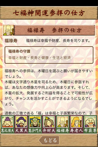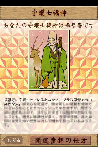 本アプリでは、守護七福神の判定機能と、福神ごとに違うとされる参拝方法、七福神の簡易解説も掲載しています。今後は運勢占い機能なども追加予定です。