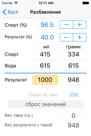 Calculator to calculate the required amount of alcohol and water (or solutions) to obtain an alcohol mixture of the desired strength. The calculation is made according to the tables, taking into account the contract.