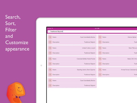 Quickly catalog, filter, sort, and manage your knives and swords collection. Add pictures, condition, price, voice notes, personal details and more!