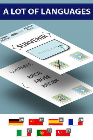 Do you want to learn and improve your English vocabulary? Then this app is for you to learn new languages. If you don’t have time to go to English classes, with LEARN ENGLISH: IRREGULAR VERBS app you can study, practice and learn English easily whenever or wherever you want. LEARN ENGLISH: IRREGULAR VERBS application provides you to study in seven different languages – Spanish, French, Turkish, German, Italian, Portuguese and Chinese. Choose your mother tongue and start to study! Learn and improve English by different options available in the app. All verbs are categorized by subject and they are all supported by audio recordings for you to hear and improve pronunciation. When you click on a verb, you can hear the different type of pronunciations according to their form (infinitive, past or past participle)