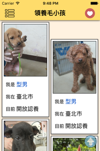 "領養毛小孩" 提供了全國縣市待領養的動物與相關連絡資訊, 請有意願養寵物的大家可以以領養代替購買,以結紮代替撲殺.