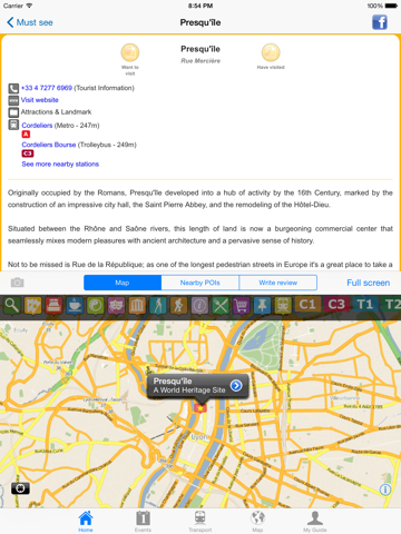 • Fully zoomable, offline maps that shows your location and points of interest around you (your location is shown on the map). If a travel guide doesn’t have a map, it’s as good as useless.