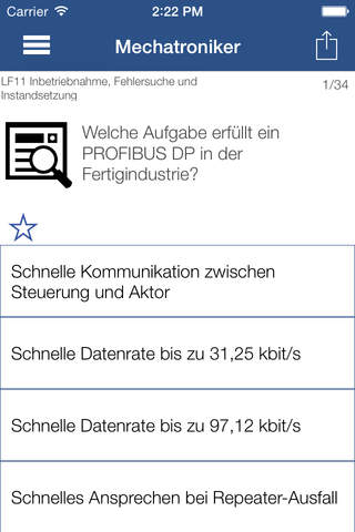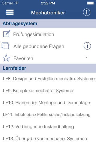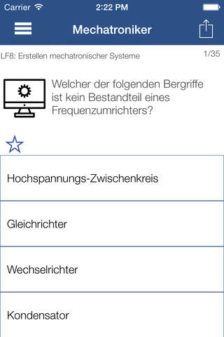 Sie wollen die Mechatroniker IHK- oder HWK-Abschlussprüfung Teil 2 bestehen? Dann ist der Mechatroniker-Trainer genau das Richtige für Sie. Schritt für Schritt werden Sie auf die schriftlichen Aufgabenstellungen vorbereitet. In unserem Trainer Modus, haben Sie die Wahl einzelne Lernfelder gezielt zu lernen. Weiterhin können sich per Zufall aus allen 6 relevanten Lernfeldern Prüfungsfragen generieren lassen. Wie in der richtigen IHK-Prüfung ist nur eine Lösungsmöglichkeit richtig. Am Ende der Trainingseinheit können Sie die nicht richtig beantworteten Fragen noch einmal wiederholen. Speichern Sie die Fragen als Favorit, die Sie als besonders schwierig empfinden um diese gezielt aufzurufen und nutzen Sie die Statistiken um Ihren Lernfortschritt optisch zu erfassen. Mechatroniker-Trainer umfasst über 200 Prüfungsfragen, die nur darauf warten von Ihnen gelöst zu werden. Mechatroniker-Trainer bietet zu jedem der 7 Lernfelder eine Zusammenfassung mit den wichtigsten Elementen. Auch eine Suchfunktion ist integriert, damit Sie schnell Ihr Ziel erreichen können. Nutzen Sie auch unsere Erinnerungszentrale und lassen Sie sich motivieren. Der Mechatroniker-Trainer eignet sich als Nachschlagewerk für unterwegs und für eine gute Vorbereitung auf die Prüfung. Einfaches Lernen ist der Schlüssel zum Erfolg!