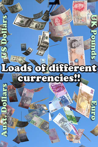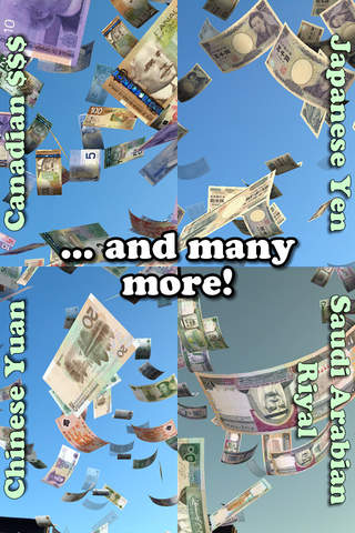 You'll see banknotes fluttering gracefully all around you in crisp, realistic 3D graphics! And thanks to Augmented Reality it actually moves when you move your phone, as if it's really there! Be a Billionaire for the day! Become the 1%!