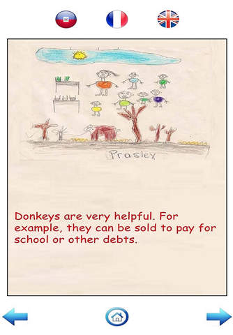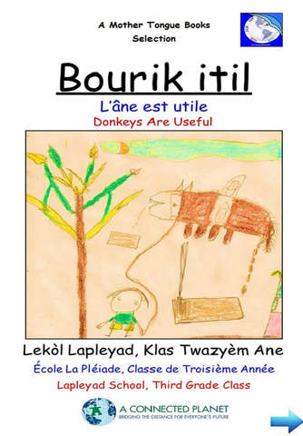 Bourik Itil was originally written in Haitian Creole and has been translated into French and English. Audio in all three languages is provided in the application. The Matènwa Community Learning Center provided the Haitian Creole recordings for the application.