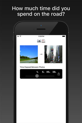 • Take a selfie at home, go on your road trip, and take another selfie at your destination and Photo Clock can easily calculate the length of your drive.