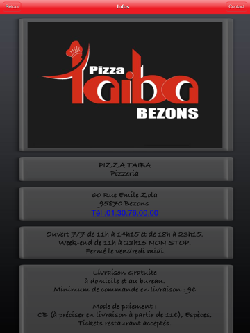 L'application "Pizza Taiba" vous offre la possibilité de consulter toutes les infos utiles du restaurant (Tarifs, carte, avis…) mais aussi de recevoir leurs dernières News ou Flyers sous forme de notifications Push.