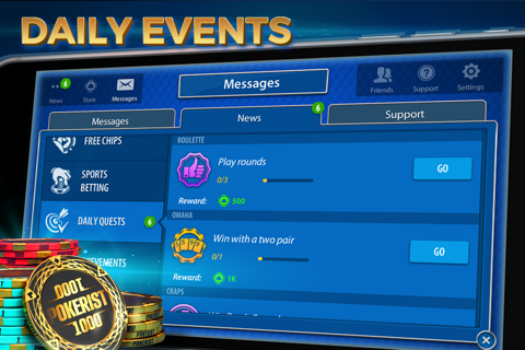 • TOURNAMENTS – Master your poker skills! Participate in WEEKLY Sit'n'Go and Shootout tournaments, where you can WIN unique trophies or millions of chips and top our Leaderboard!
