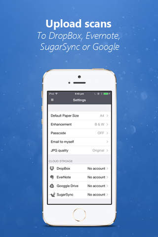 It enables you to quickly scan documents on the go and email the scans as JPEG or PDF with multiple pages. You can easily export your scan to DropBox, EverNote,SugarSync and other cloud services.