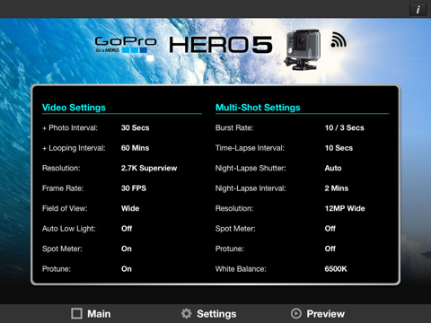 Control your GoPro Hero 5 remotely. Features include video resolution, frame rate, field of view, protune settings, photo resolution, burst rate, night shots, spot meter, LED and Beep settings, startup modes and video type.