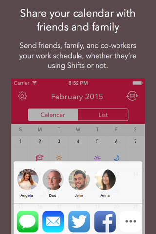 With just a tap you can share your schedule with friends, family, and co-workers – whether they’re using Shifts or not.