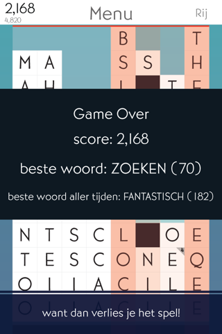 Kies je woorden slim! Terwijl je speelt komen er onderin het scherm meer tegels bij en je hebt al je lexicologische kennis en tactiek nodig om te zorgen dat ze daar blijven. Als een letter in de bovenste rij komt, verlies je het spel.