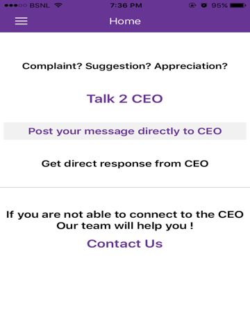 Talk2CEO platform allows you to post your message directly to CEO of different businesses in simple & effective way. You will get response directly from the CEO.