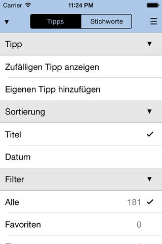 Die Tipps lassen sich über Stichworte und eine Freitextsuche einfach finden. Lassen Sie sich über die Zufallsfunktion inspirieren. Markieren Sie Tipps als Favoriten; diese lassen sich über einen Filter besonders schnell wiederfinden. Einzelne Tipps können Sie per Text und E-Mail an Freunde & Bekannte versenden.