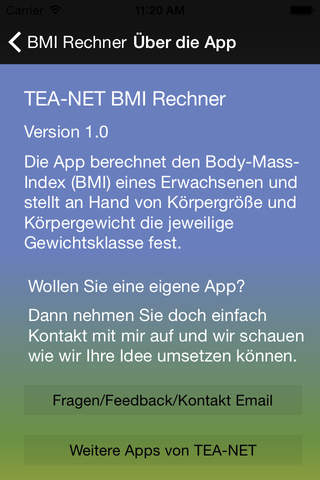 Diese App berechnet den Body-Mass-Index (BMI) eines Erwachsenen und stellt an Hand von Körpergrösse und Körpermasse die jeweilige Gewichtsklasse fest.