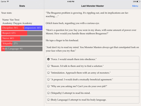 "The Last Monster Master" is an epic 250,000-word interactive fantasy novel by Ben Serviss, where your choices control the story. It's entirely text-based—without graphics or sound effects—and fueled by the vast, unstoppable power of your imagination.