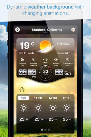 • Dynamic weather background with changing animations, to reflect real-time weather conditions and also day time / night time of any given location.