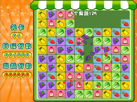 点击相连在一起的相同颜色的果蔬方块进行消除,消的越多,得分越高,大家快来挑战一下吧!