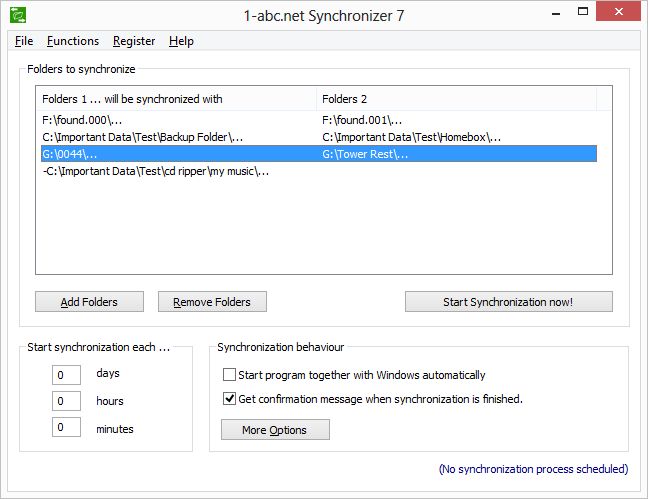 1-abc.net Synchronizer je užitečná aplikace pro snadnou synchronizaci souborů mezi vybranými složkami. Synchronizovat lze například data mezi pevným a přenosným USB diskem nebo klíčenkou. Program podporuje drag and drop a synchronizaci souborů je možné provádět i automaticky v nastavený čas. Předností programu je také velmi snadné ovládání.