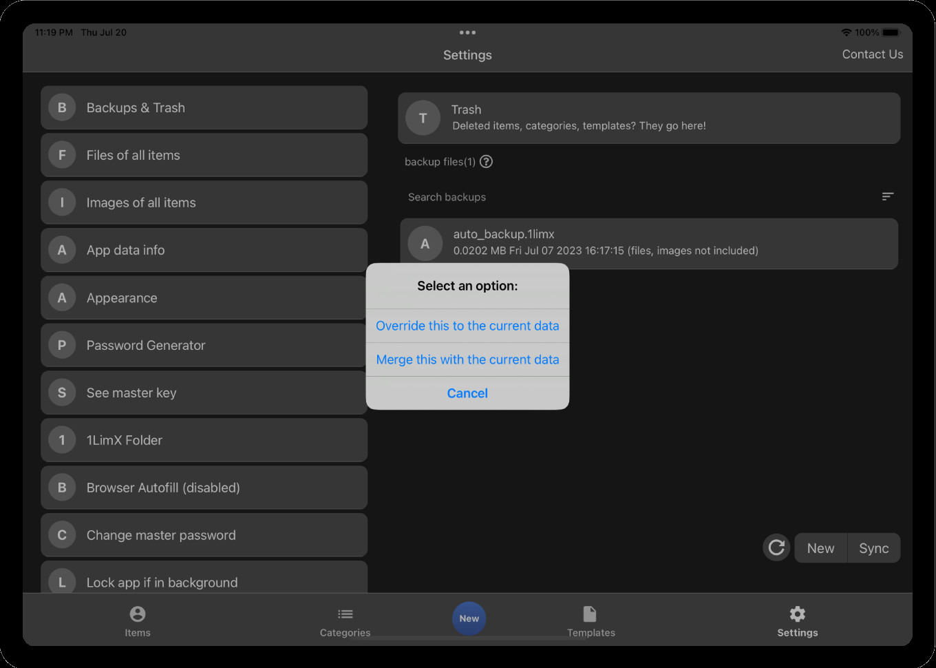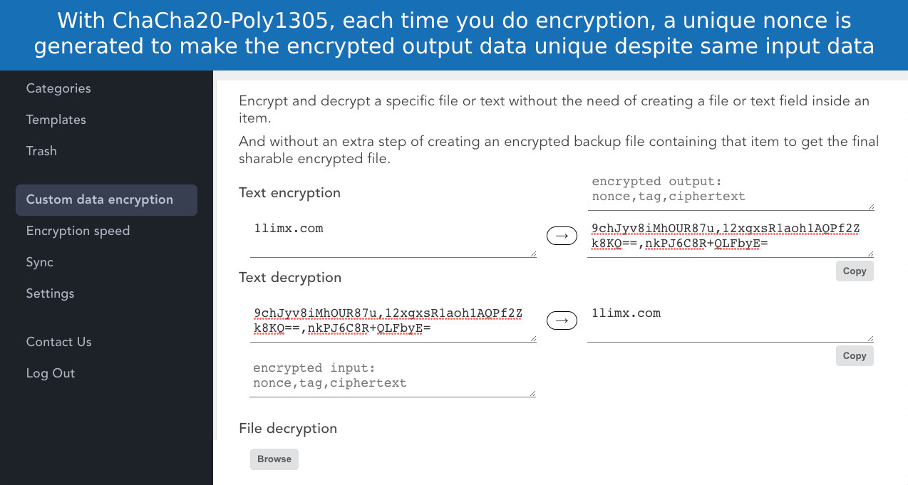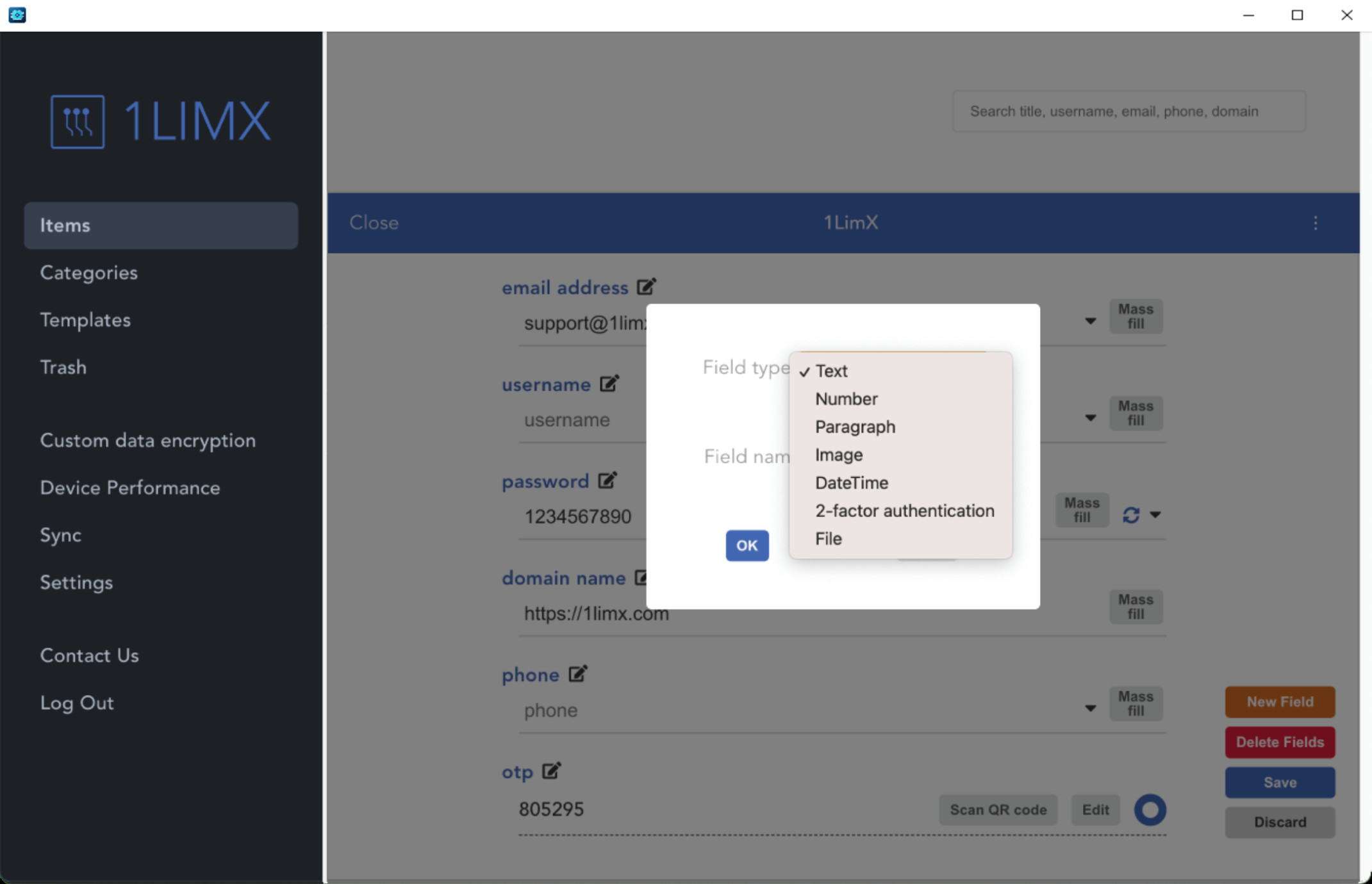 1LimX je nástroj sloužící pro přehlednou správu hesel a dalších citlivých nebo soukromých údajů. Uložená data jsou zabezpečena 25-bitový algoritmem ChaCha20-Poly1305 a pro pro přístup k datům je nutné zadat hlavní heslo. Ukládat lze nejen hesla, ale také texty, obrázky, soubory, 2FA kódy atd.