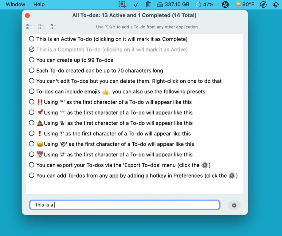 99 Things for Mac je nástroj sloužící pro snadnou správu úkolů v počítačích s macOS. Úkoly lze přidávat téměř z jakékoli jiné aplikace, filtrovat je, přizpůsobit zobrazení, exportovat úkoly, nastavit pravidelné připomínky nebo používat emotion ikonky pro zdůraznění konkrétních úkolů.